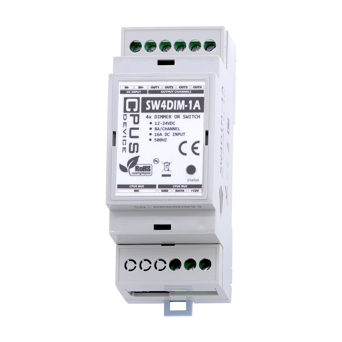 SW4DIM-1A je určený na spínanie a stmievanie - plynulú reguláciu príkonu pre zariadenia, ktoré sú napájané jednosmerným prúdom a napätím do 24 V. Má štyri nezávislé kanály, pričom každý kanál môže